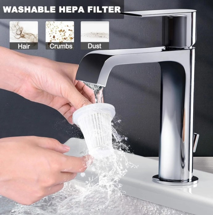 Curățenie Ușoară și Rapidă: Curățarea este simplă, datorită rezervorului de praf ușor de golit și a filtrului reutilizabil. Acest aspirator portabil asigură o curățare eficientă, economisind timp și efort.