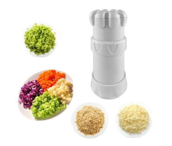 Acest dispozitiv cojeste si taie in 81 de cuburi perfecte, pastreaza vitaminele, uleiurile si substantele nutritive ale usturoiului, de asemenea este potrivit pentru razuirea si felierea diverselor alimente mici.