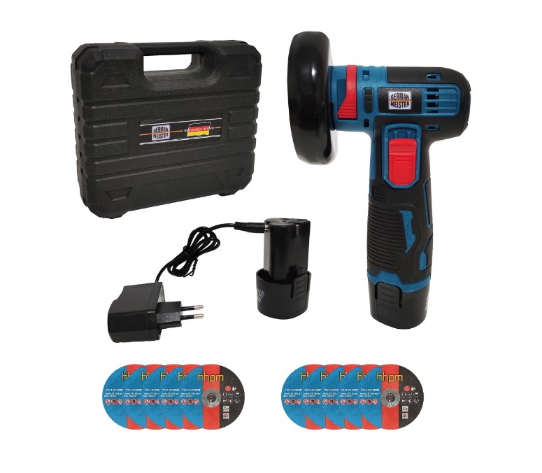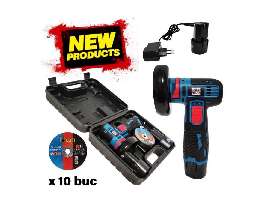 Mini polizor unghiular German Meister – 2 acumulatori 12V, 10 discuri incluse