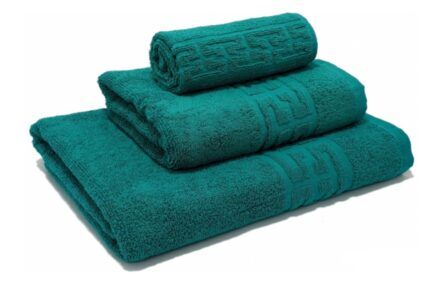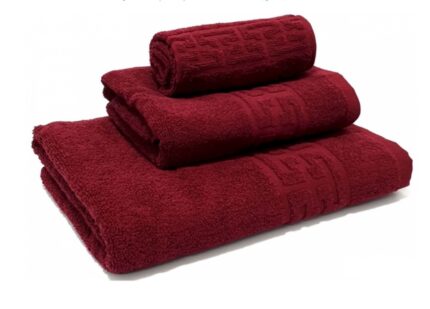 Set 3 prosoape de baie din bumbac 100%, mov, model grecesc. Absorbție ridicată, durabilitate și culori rezistente. Eleganță și confort pentru baia ta!
