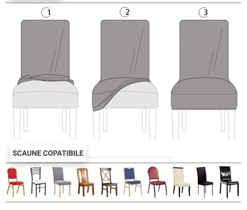 Set 6 huse elastice pentru scaune cu spătar, lavabile, ușor de întreținut. Se potrivesc perfect și protejează scaunele. Disponibile în mai multe culori.