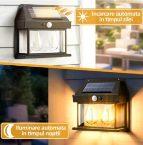 Lămpi solare cu bec, ideale pentru iluminatul exterior, echipate cu senzor de mișcare, panouri solare eficiente și 3 moduri de funcționare. Asigură lumină caldă și puternică, fără cabluri, cu autonomie de până la 10 ore.