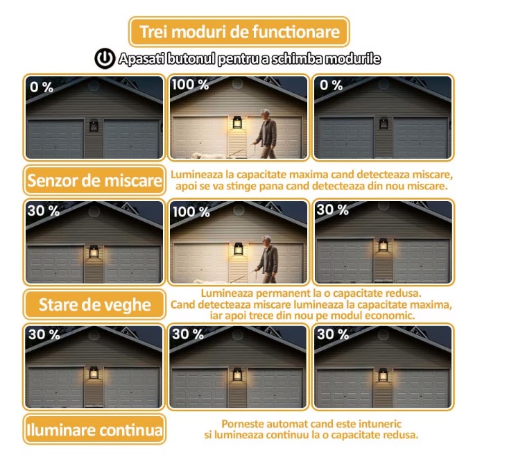 - Mod senzor de mișcare – Lampa se aprinde la intensitate maximă doar când detectează mișcare.